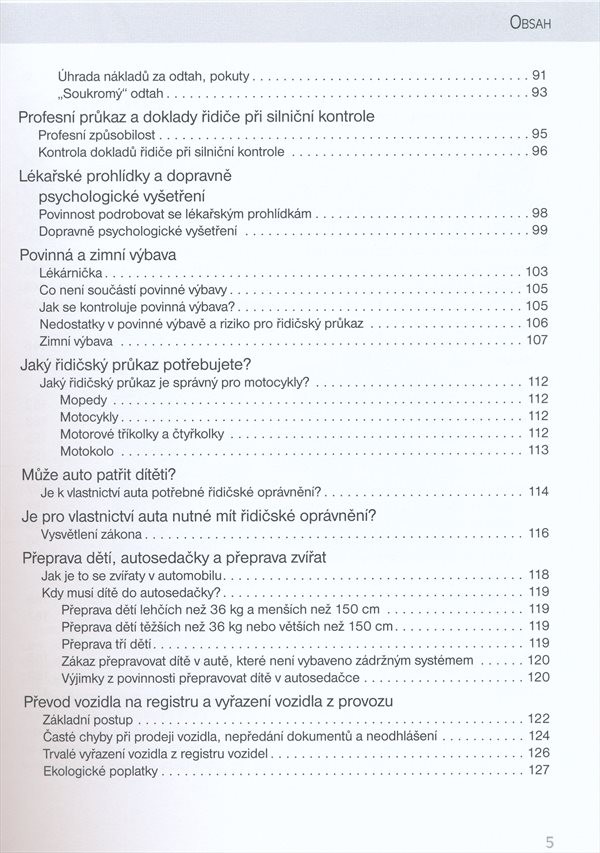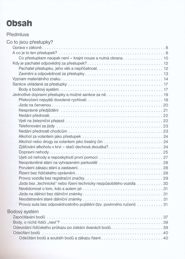 Příručka se zabývá problematikou dopravních přestupků, bodového systému, měření rychlosti, zabavení řidičského průkazu, platnosti dopravních značek, zimní výbavy, přepravy dětí i zvířat, porušování pravidel silničního provozu, dopravních nehod, povinné výbavy nebo povinností cyklistů. Kromě základních výkladů zde najdeme také otázky a odpovědi na jednotlivé problémy.