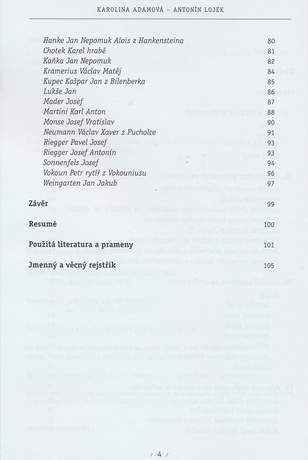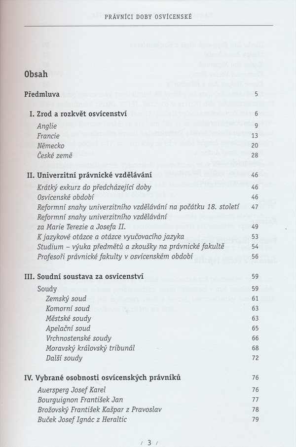 Práce sleduje počátky osvícenství i problematiku univerzitního právnického vzdělání u nás během 18. století. Nechybí ani přehled soudů působících na našem území v období osvícenství a medailony výrazných právnických osobností 2. poloviny 18. století.