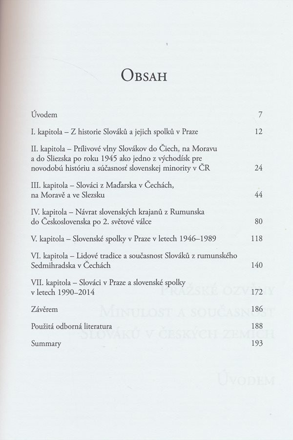 Zvláštností této vědecké studie o největší národnostní menšině, která nyní v naší republice žije, je její upozornění na skutečnost, že jsme Slováky žijící v Česku jako menšinu nevnímali. Proto se studie zabývá česko-slovenskými vzájemnými vztahy v několika polohách - jak se utvářely v době společného státu před válkou a po ní i nakolik se změnily po rozdělení republiky. Uvádí nás i do prostředí mnohým z nás neznámého - jak tato menšina žije uvnitř své komunity, jaké má spolky, sdružení, jak si uchovává svou národnost, byť její příslušníci přijali naše občanství. Studie se zakládá na autorčině dlouholeté badatelské činnosti.