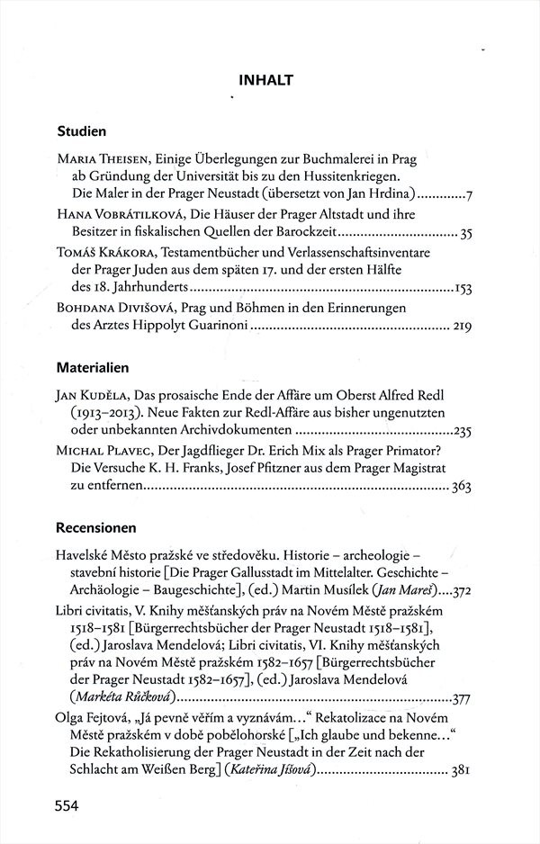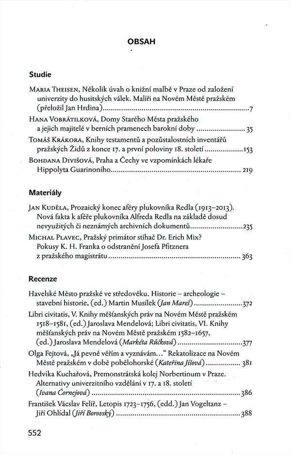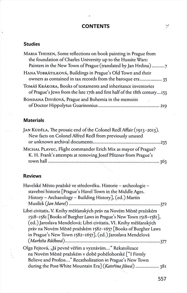 Název dílčí částiArcheologický výzkum v Praze v letech 2011-2012 /; Knihy testamentů a pozůstalostních inventářů pražských Židů z konce 17. a první poloviny 18. století; Několik úvah o knižní malbě v Praze od založení univerzity do husitských válek; Domy Starého Města pražského a jejich majitelé berních pramenech barokní doby /
