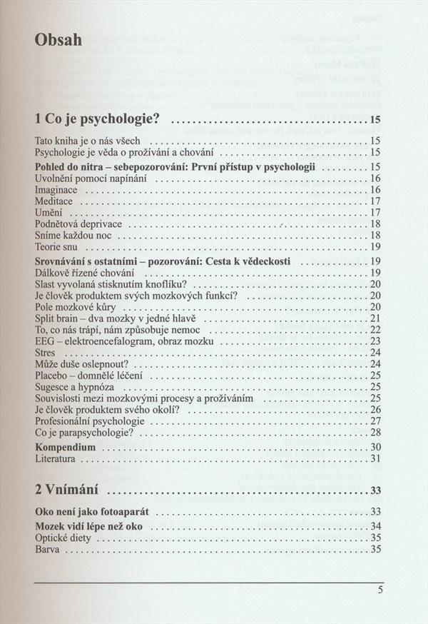 Kniha je rozčleněna do kapitol pojednávajících jak o předmětu psychologie obecně, hlavních metodách a přístupech, tak také o jednotlivých psychických procesech - jako je vnímání, učení, myšlení, motivace, řeč - a specializacích (základy psychologie osobnosti, vývojová a sociální psychologie). Texty uvnitř kapitol se dělí do přehledných, stručně psaných bloků, vzájemně provázaných odkazy a doplněných názornými obrázky či zvýrazněnými rámečky se shrnujícím textem. Nechybějí ani krátké seznamy doporučené literatury - bohužel německé, i když na závěr celé knihy je pro čtenáře připraven přehled literatury doplněné pro české vydání. Řada informací je velice zajímavá, nicméně čtenář je odkázán pouze na obsah v úvodu knihy. Podrobnější abecední rejstřík jednotlivých pojmů chybí.