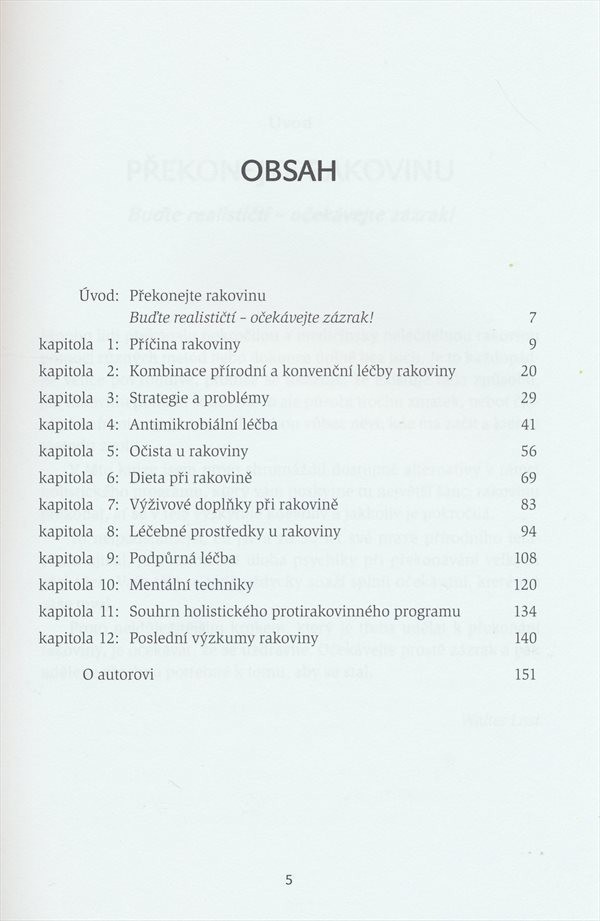 Vysvětlení příčin rakoviny. Kombinace přírodní a konvenční léčby. Dostupné alternativy v rámci holistického programu k vyléčení jakkoliv pokročilé rakoviny. Osvědčený protirakovinný program a doplňkové svépomocné možnosti (např. pročištění těla, kvalitní výživa, zlepšení psychiky). Výživové doplňky. Mentální techniky, mysl je nejdůležitějším léčebným faktorem při léčbě (musíme očekávat zázrak a udělat všechno pro to, aby se stal).