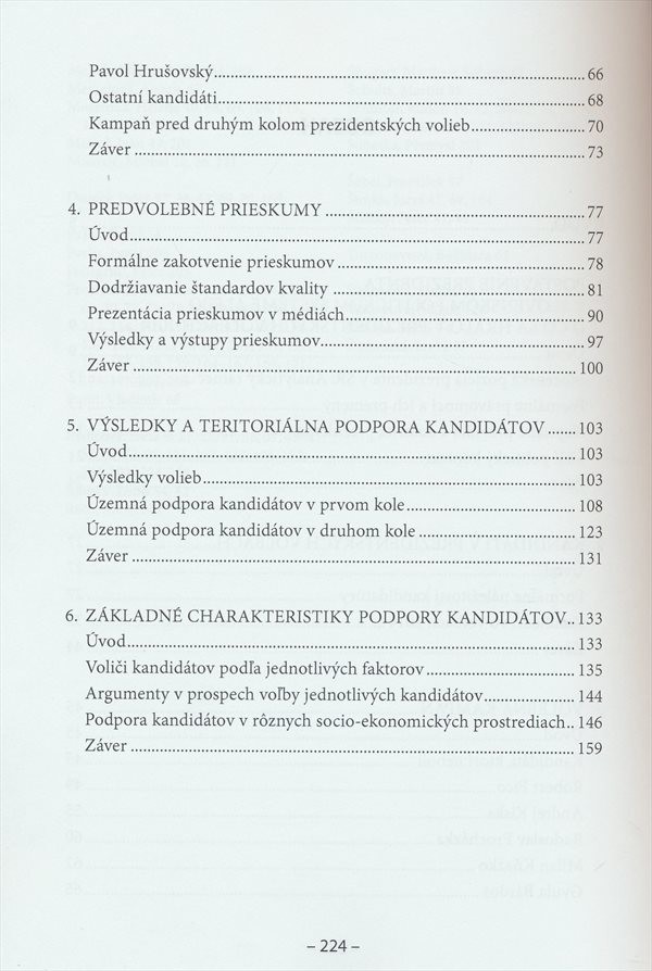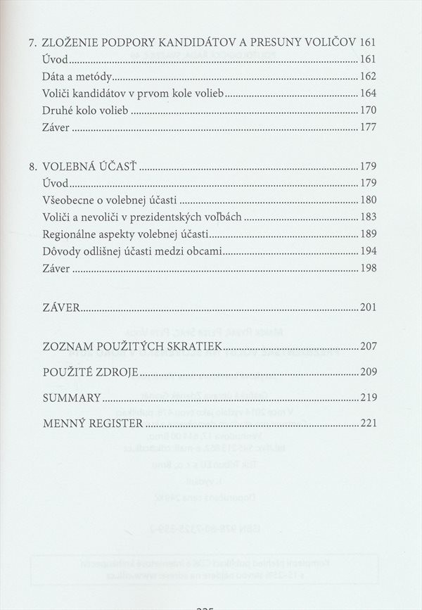 Monografie se zaměřuje na kanditáty, volební průzkumy, průběh volební kampaně, volební účast a výsledky slovenských prezidentských voleb konaných v roce 2014.