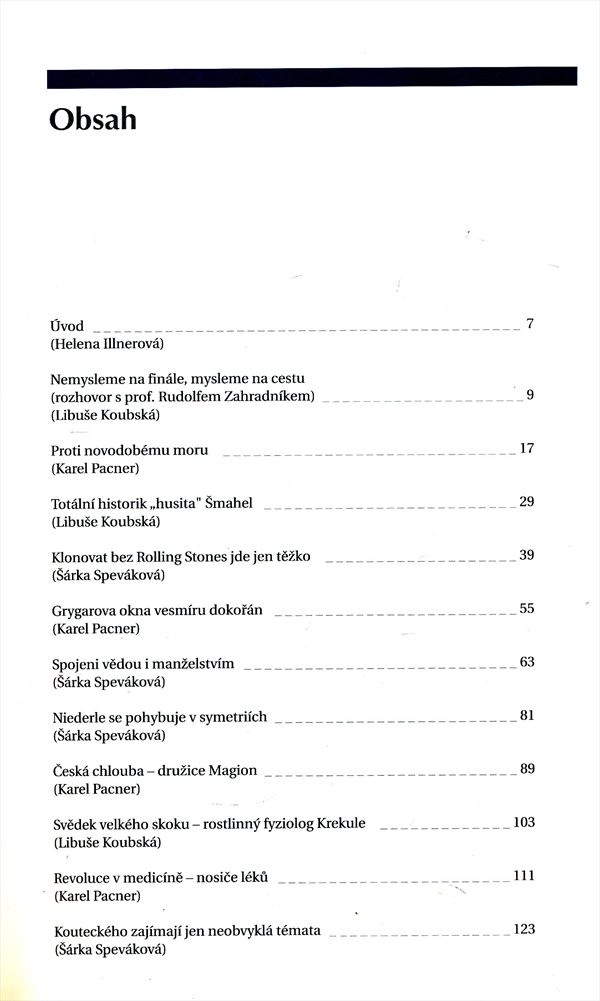 Knížka přináší dvacet dva portrétů - medailonů nejpřednějších českých vědců. Portréty byly napsány při příležitosti desátého výročí vzniku Akademie věd ČR. Zastoupení vědci působí v nejrůznějších oblastech vědy: v biochemii, fyziologii, astronomii, medicíně, historii...Všem je společná nesmírná píle dokázat ve svém oboru co nejvíce a věnovat mu veškerý čas. Autoři portrétů se neomezují jen na pracovní život vědců, ale přibližují je též jako soukromé osoby žijící v rodinných vztazích. Vzniklé medailony tak působí plasticky a zachycují vědce i jako "obyčejné" lidi s denními starostmi.
