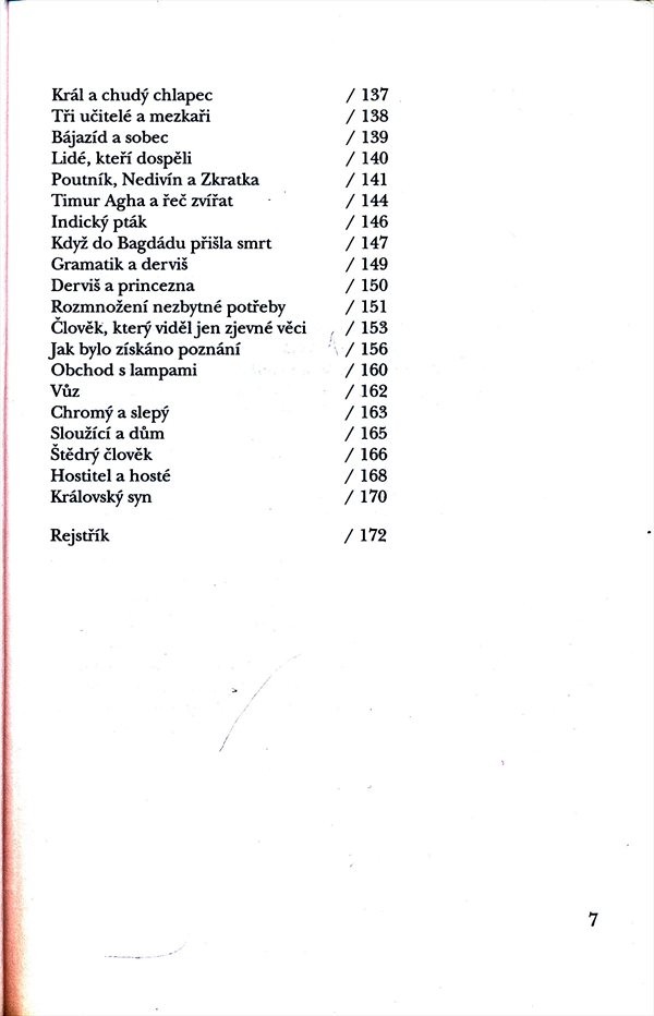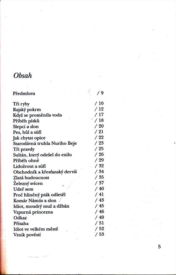 Soubor pradávných legend a vyprávění s pohádkovými motivy, z nichž některé se používají k výuce v současných súfijských školách. Texty jsou půvabné i poučné svými jinotaji, podobenstvími, nadsázkou i jemným humorem. Za každým příběhem je poznámka, která vysvětluje pointu a zmiňuje se o údajném původci. Kniha je překlad z angličtiny a autor či sestavitel Idries Shah napsal několik knih o súfismu.