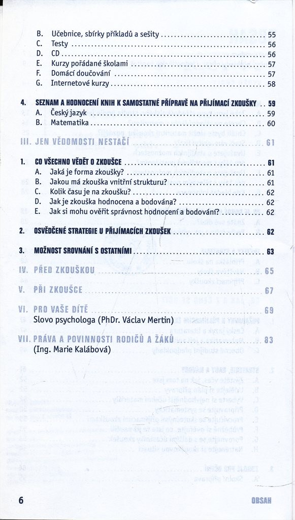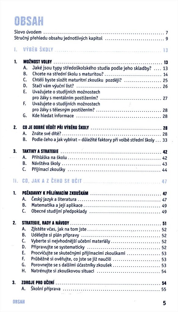 Příručka přináší informace, které usnadní výběr střední školy či učebního oboru, poradí, jak děti na přijímací zkoušky připravit, seznamuje s osvědčenými strategiemi, jak u zkoušek obstát.