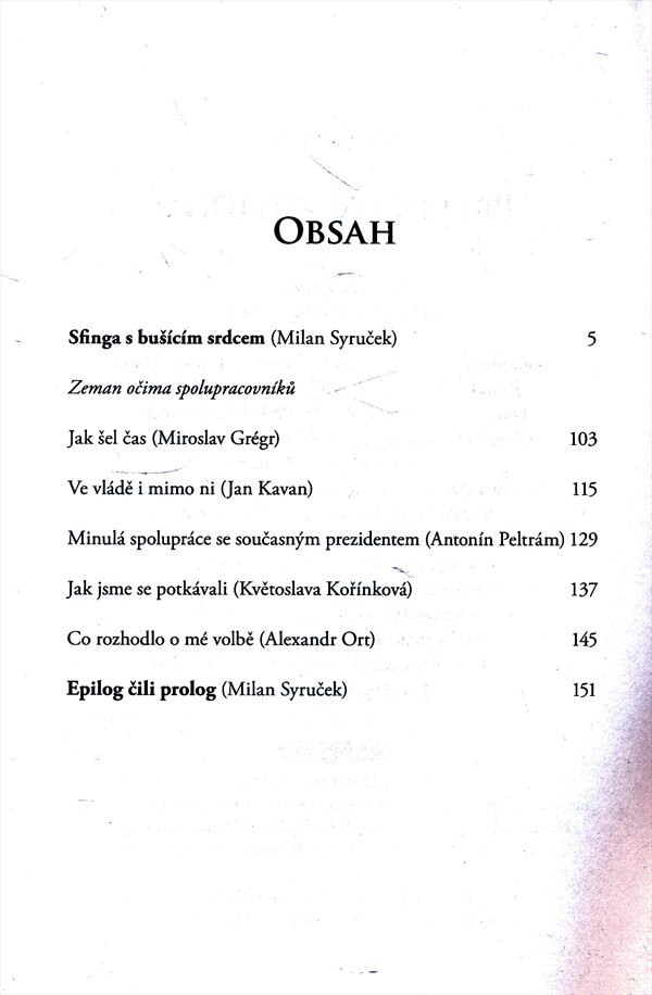Knihu tvoří vzpomínky politiků M. Grégra, J. Kavana, A. Peltráma a K. Kořínkové, historika a politologa A. Orta a novináře M. Syručka. Právě Syručkova pasáž je nejobsáhlejší; popisuje své vztahy k Zemanovi, jeho názory na vnitropolitická (např. vztahy k českým politikům, spolupráce české levice) i zahraničněpolitická témata (např. Rusko, Evropská unie, česká zahraniční politika, islámský fundamentalismus) a nevyhýbá se ani některým osobním vlastnostem tohoto výrazného českého politika. Text doplňují černobílé fotografie.
