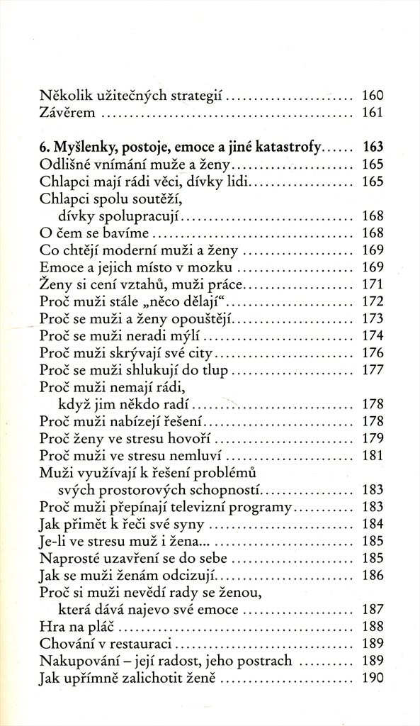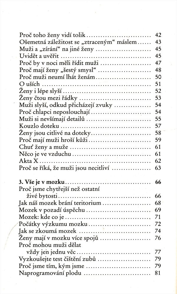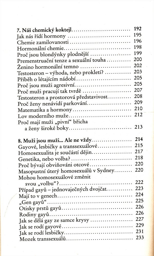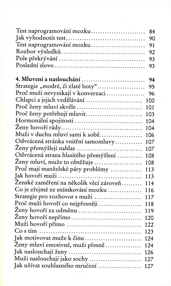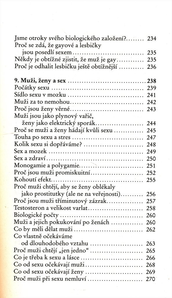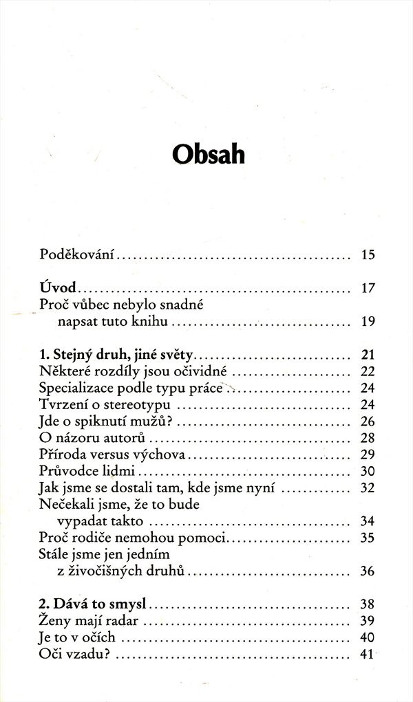 Kniha přináší objektivní pohled na vztahy mužů a žen a vysvětluje rozdíly mezi myšlením příslušníků opačného pohlaví na základě biologických, lékařských, psychologických a sociologických výzkumů. Opírá se o ověřené poznatky ze sociobiologie a způsobem velmi přístupným napomáhá k lepší komunikaci.
