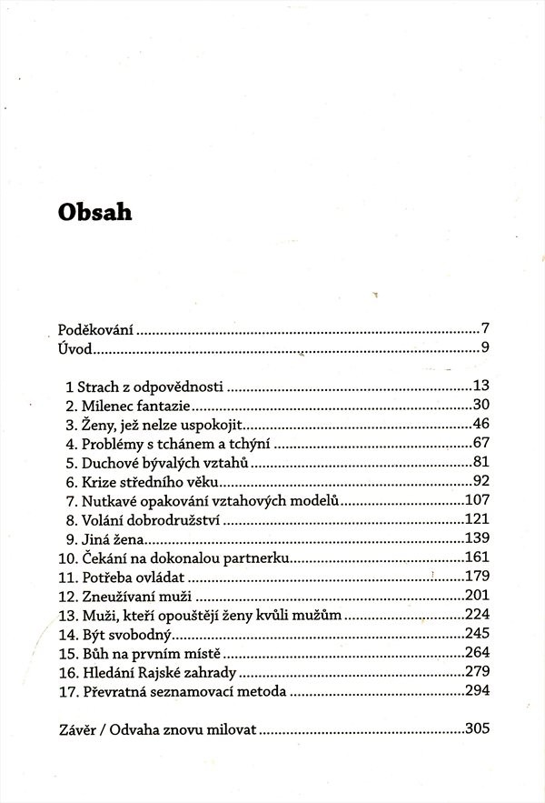 Kniha o vztazích mužů a žen v podobě příběhů, kdy muži - reprezentanti problémových vztahů - vyprávějí své osudy a peripetie týkající se milostného a partnerského života. Příběhy doplňují výklady různých psychologů a terapeutů a závěrečná poučení, věnovaná zvlášť ženám a zvlášť mužům, jak předcházet popisovaným komplikacím. Text navíc oživují citáty. Jednotlivé kapitoly jsou členěny tematicky podle problémů, které se ve vztazích mužů a žen vyskytují. Závěr knihy uvádí metodu pro vytvoření správného partnerského vztahu.
