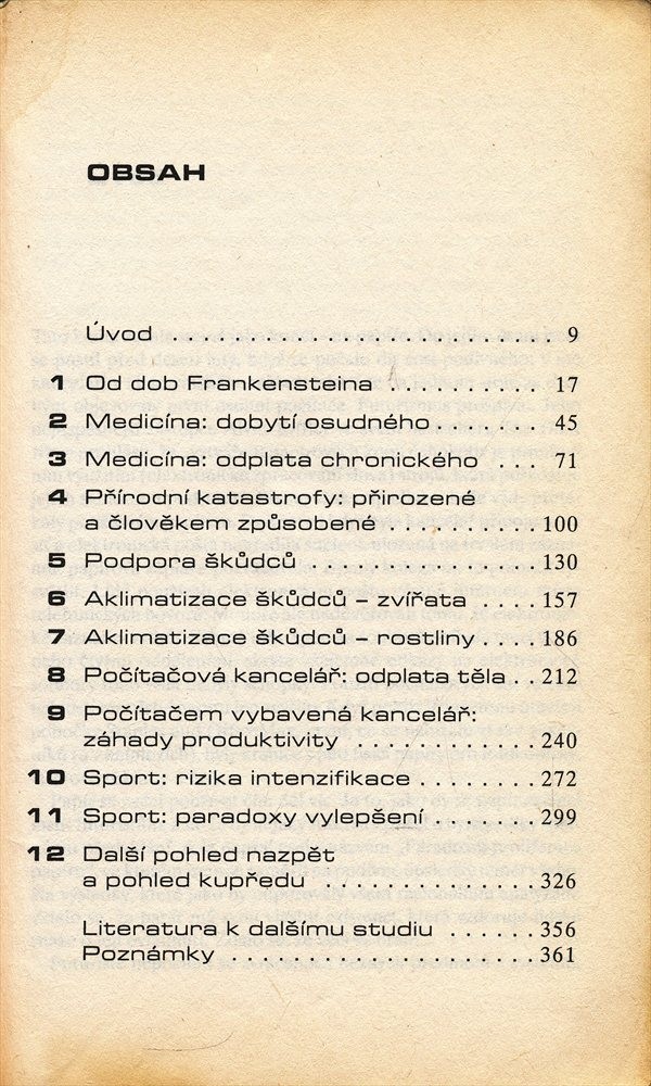 Čtivý, faktograficky hodnotný výklad důsledků nových technologií a jejich vlivu na všechny obory lidské činnosti. Americký publicista se zamýšlí nad nechtěnými ekologickými katastrofami a zbytečnými úmrtími, které jsou nepředvídanými důsledky jinak velmi prospěšných vynálezů. Na příkladu Spojených států líčí důsledky průmyslových emisí a intenzifikace zemědělství na životní prostředí. Kritizuje nebezpečí diagnostických metod pro život pacienta (s. 67: na katerizaci plicní tepny v USA zemřelo již 100 tisíc pacientů). Nadměrné užívání antibiotik vedlo k oslabení jejich léčebných účinků. Stejně sedavá práce u počítače vede k chorobám páteře, které mj. snižují výkonnost pracovníků. Kontraproduktivním "lékem" na sedavou práci může být sport, ale ten je buď příliš nebezpečný (běh pro klouby, lyžování pro vazivo), nebo drahý (golf, tenis). - Kniha je provázena poznámkami a doplněna přehledem doporučené literatury.