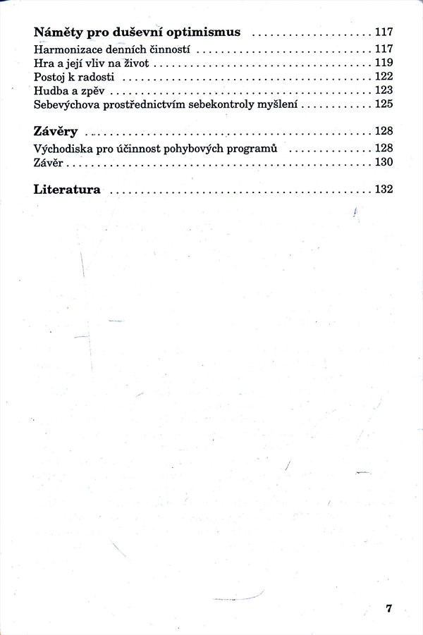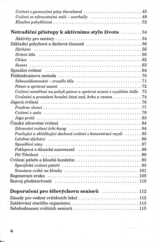 Úvodní kapitoly jsou teoretické - probírají stáří a stárnutí, zdraví a prevenci chorob i výsledky výzkumů, které sledovaly tělesné zatěžování staršího organismu. Velký zájem je věnován i životosprávě v pokročilém věku. Další kapitoly se zabývají kondiční přípravou staršího organismu a uvádějí některá cvičení na zlepšení rovnováhy a kloubní pohyblivosti. Následují dechová cvičení, spinální, uvolňovací i výběr jógových a čínských zdravotních cvičení. Na závěr jsou připojeny některé specifické cviky pro páteř a klouby. Všechny cviky doprovázejí návodné obrázky. Poslední kapitoly jsou určeny zejména cvičitelům seniorských pohybových kurzů jako metodická příručka, ale mohou je využít i cvičenci.