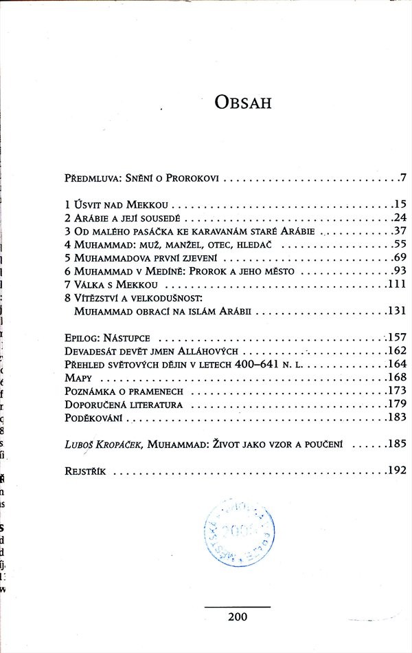 Kniha je životopisem proroka Muhammada, zakladatele islámu. Provází nás jeho životem od narození až do smrti. Životopis je přitom zasazen do širších dějinných souvislostí 6. století. Autor zachycuje prorokův lidský a rodinný život, jeho ženy i děti. Dozvíme se i podrobnosti o jeho povaze a zvycích. Zároveň je Muhammad líčen i jako prorok: autor popisuje průběh jeho zjevení a postupný vznik posvátného Koránu. Popsány jsou také Muhammadovy války i postavy jeho nejbližších souvěřících a následovníků. V závěru knihy najdeme chronologický dějinný přehled událostí 4. až 7. století, mapy Arábie a Muhammadových bitev, širší pojednání o pramenech knihy a jmenný rejstřík.