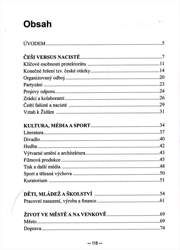 Práce se nejprve stručně věnuje událostem z podzimu 1938 předcházejícím vzniku Protektorátu (mnichovská dohoda, období 2. republiky), průběhu německé okupace z 15. března 1939, zřízení Protektorátu Čechy a Morava, následuje přehled důležitých osobností z období let 1939-1945, rozbor nacistických plánů na konečné řešení tzv. české otázky, pohled na odboj a kolaboraci během Protektorátu, přehled nacistických organizací a vztahy k Židům. Další kapitoly se zaměřují na kulturní život, sport, školství, život obyvatel ve městech a na venkově, výživu, úroveň tehdejší zdravotní péče, postavení národnostních menšin (Romové, Židé) nebo otřesné podmínky v terezínském ghettu. Poznámky, fotografie a nechybí ani ukázky dobových anekdot.