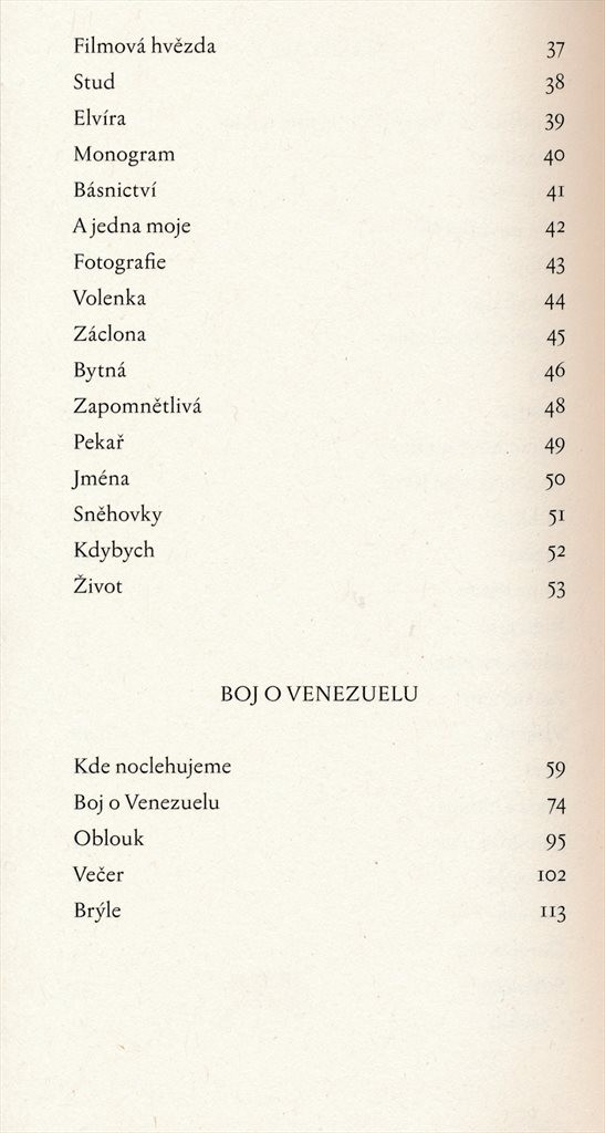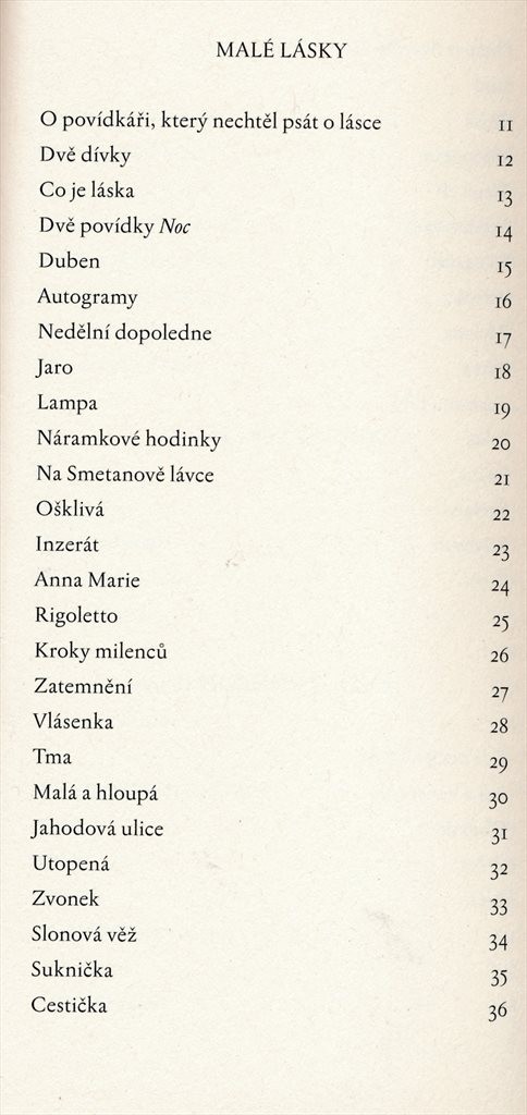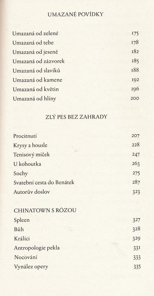 | Název dílčí části | Malé lásky --; Boj o Venezuelu --; Umazané povídky --; Zlý pes bez zahrady --; Chinatown s Rózou --; Silva rerum --; Dopis o zemětřesení --; Desetkrát o něčem --; Drobné texty --; Natura miniatura; O povídkáři, který nechtěl psát o lásce --; Dvě dívky --; Co je láska --; Dvě povídky Noc --; Duben --; Autogramy --; Nedělní dopoledne --; Jaro --; Lampa --; Náramkové hodinky --; Na Smetanově lávce --; Ošklivá --; Inzerát --; Anna Marie --; Rigoletto --; Kroky milenců --; Zatemnění --; Vlásenka --; Tma --; Malá a hloupá --; Jahodová ulice --; Utopená --; Zvonek --; Slonová věž --; Suknička --; Cestička --; Filmová hvězda --; Stud --; Elvíra --; Monogram --; Básnictví --; A jedna moje --; Fotografie --; Volenka --; Záclona --; Bytná --; Zapomnětlivá --; Pekař --; Jména --; Sněhovky --; Kdybych --; Život --; Kde noclehujeme --; Boj o Venezuelu --; Oblouk --; Večer --; Brýle --; Umazaná od zeleně --; Umazaná od tebe --; Umazaná od jeseně --; Umazaná od zázvorek --; Umazaná od slavíků --; Umazaná od kamene --; Umazaná od květin --; Umazaná od hlíny --; Procitnutí --; Krysy a housle --; Tenisový míček --; U kohoutka --; Sochy --; Svatební cesta do Benátek --; Autorův doslov --; Spleen --; Bůh --; Králíci --; Antropologie pekla --; Nocování --; Vynález opery --; Večerní modlitba --; Doma se Shakespearem --; Fotogenie ducha --; Bývalý fotograf --; Kapitán --; Chinatown s Rózou --; Arma virumque cano --; Konec války --; Zimní zmrzlina --; Noční ženy --; Pohádka z hladu --; Na obzoru bílé stránky --; Věnování --; Firma falešných svědků --; Sobotní směna --; Alexandrijská knihovna --; Smrt kardinála --; Baltazarova smrt --; Sedm variací v kufru --; Zahradníkovo spiknutí --; Konfrontace --; Václav --; Šťastné dny --; V půli cesty --; Nekázanka --; Návrat --; Kdo se smrtí zachází... --; Smích a pláč --; Zdvihám číši --; Amsterodam --; Noční sochař --; Zítra --; Melancholie --; Mozartova opera --; Co je zlaté --; Prorok --; Podoba --; Na cestě --; Stáří --; Šálek čaje --; Vojenským dalekohledem --; Noční koně --; Jehla s perlou --; Píšu prstem po pylu ze zahrad --; Tři zlaté vlasy Barbory --; Prstýnek --; Tři sestry --; Večer večeře --; Pokažený trik D. Donizettiho |