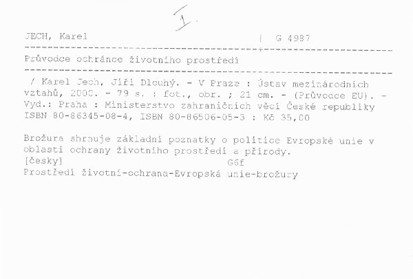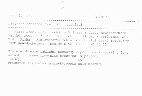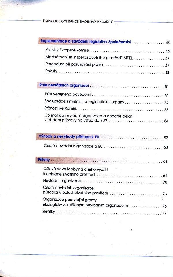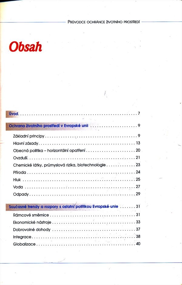 Informativní brožura stručně shrnuje základní principy ochrany životního prostředí v EU. Seznamuje s rámcovými směrnicemi, ekonomickými nástroji, úlohou Evropské komise. Část knihy je věnována úloze nevládních organizací v prosazování a dodržování trendu trvale udržitelného rozvoje. V příloze najdeme seznam zahraničních a českých neziskových organizací působících v oblasti ochrany životního prostředí.