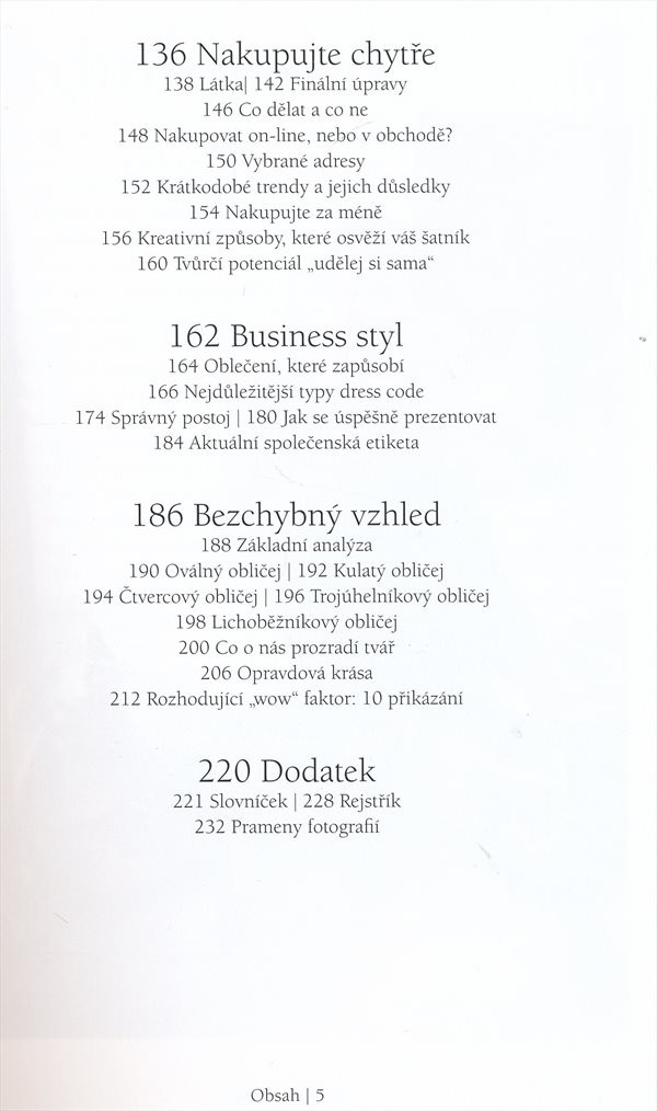 Průvodce stylem pro ženy objasňuje základní, všeobecně platné a dlouhodobě uznávané zásady dobrého stylu oblékání pro každou ženu a nabízí praktické tipy pro všechny situace od pracovních schůzek přes slavnostní příležitosti až po volnočasové aktivity. Příklady vhodného oblečení pomáhají čtenářkám správně zvolit a kombinovat jednotlivé oděvní součásti i na základě typu postavy, tvaru obličeje a barev. Nakladatelská anotace. Kráceno.