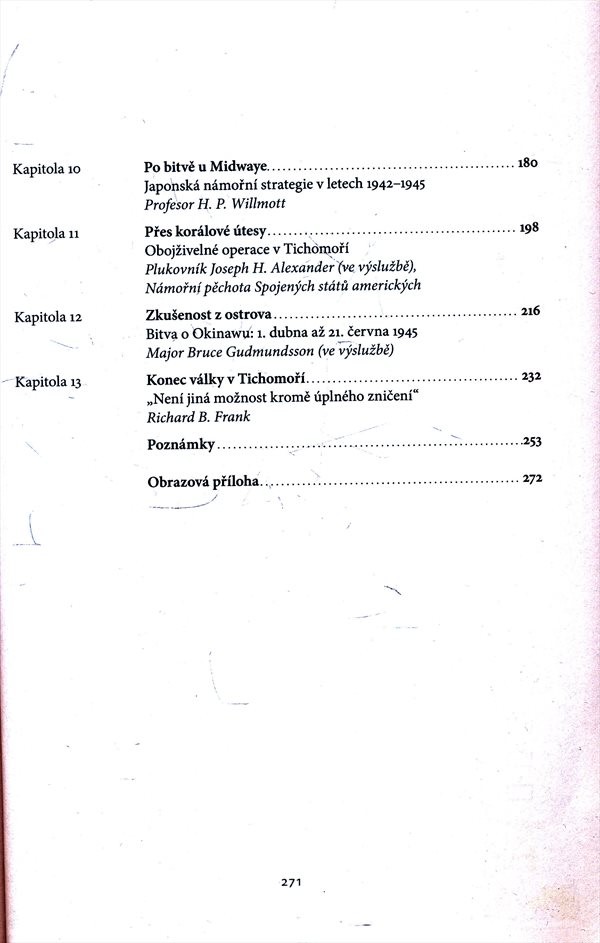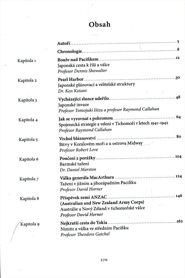 Každý z autorů pojednává ve své kapitole o jednom z aspektů tohoto válečného konfliktu, od plánování operací až po zkušenosti vojáků nasazených v boji, od útoku na Pearl Harbor po zničení měst Hirošima a Nagasaki atomovou bombou. Přehledného průvodce událostmi, které zásadně ovlivnily vývoj tažení v Tichomoří, sestavil Daniel Marston, respektovaný odborník na vojenskou historii. Spolu s dvanácti dalšími přispěvateli vytvořil ojedinělý, kritikou oceňovaný sborník, jenž přináší srovnání pohledů na druhou část druhé světové války odehrávající se v oblasti Pacifiku z americké, japonské, australské a britské perspektivy. Jde o skvělou knihu pro každého, kdo zná základní fakta o válce v Pacifiku, ale rád by své znalosti prohloubil. Nakladatelská anotace. Kráceno.