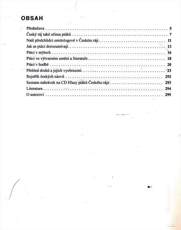 Základní informace o životě vybraných druhů ptáků s důrazem na poznávání v přírodě, hlas, prostředí výskytu, hnízdění, potravu, tah, výskyt v Českém ráji a zajímavosti. Součástí knihy je CD.