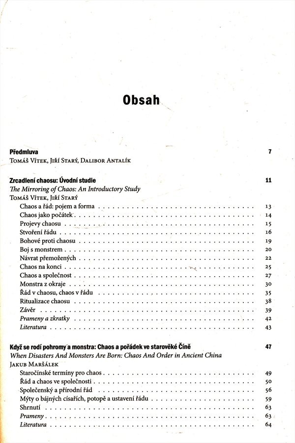 Sedm studií analyzující řád a chaos ve vybraných kulturách, jejichž autoři charakterizují hlavní fenomény, jež byly tradičně vnímány jako chaotické a nebezpečné. Popis typických způsobů, jimiž se archaické kultury chaosu bránily.