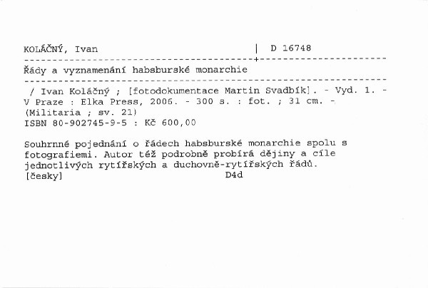 Souhrnné pojednání o řádech habsburské monarchie spolu s fotografiemi. Autor též podrobně probírá dějiny a cíle jednotlivých rytířských a duchovně-rytířských řádů.