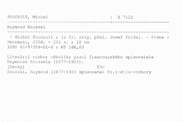 Autor, francouzský filozof, vychází z Rousselovy vlastní práce Jak jsem napsal některé své knihy. Toto dílo je pro něj vodítkem k rozboru některých básníkových děl, zvláště knihy Dojmy z Afriky a Locus Solus. Foucault rozebírá tyto literární práce z různých hledisek, zvláště však se zaměřuje na význam slov. Důkladný literární rozbor je náročnou četbou pro znalého čtenáře.