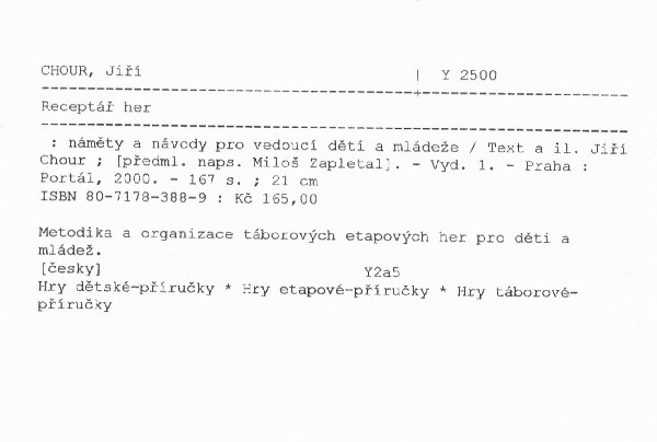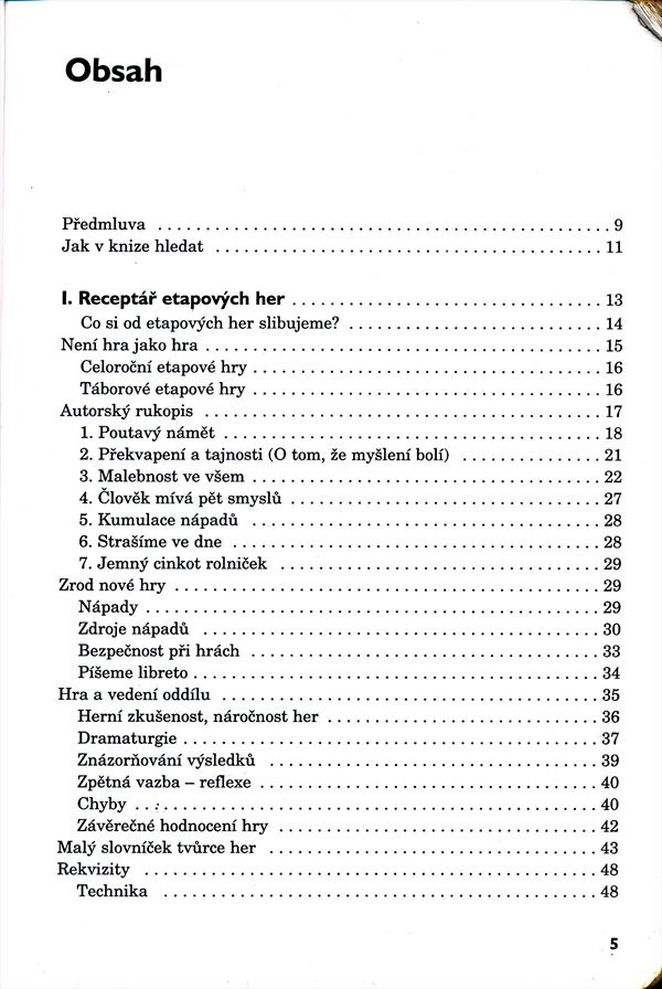 Jiří Chour, vedoucí turistického oddílu mládeže, sestavil příručku vhodnou např. pro organizátory letních táborů. Mnoho podnětů zde najdou i pracovníci domů dětí a mládeže nebo učitelé. Nalezneme zde desítky her, závodů a soutěžních úkolů. Autor využívá při tradičních hrách v přírodě moderní technické pomůcky (vysílačky, mobilní telefony, magnetofony atd.).
