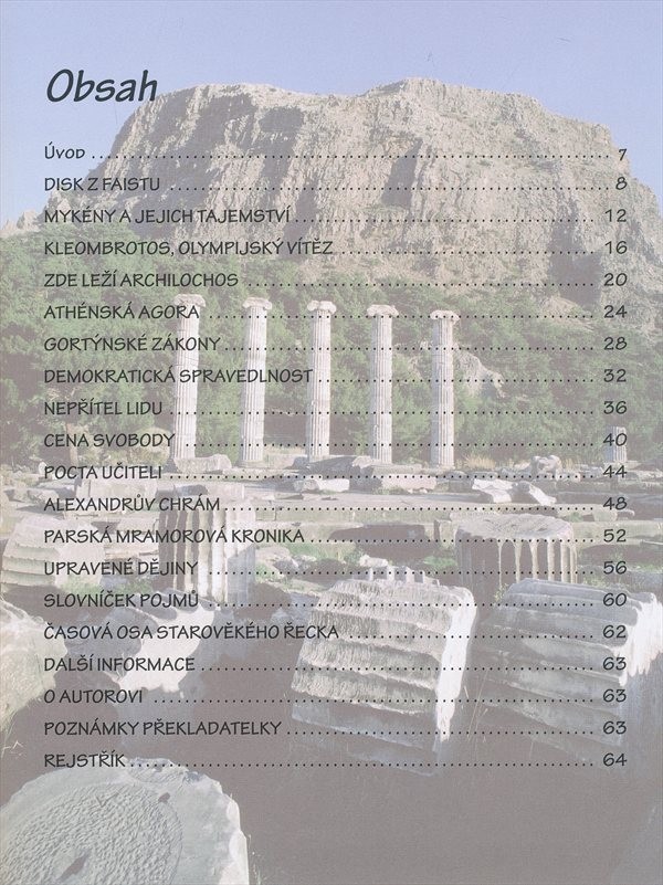 Obrazová publikace seznamuje se zajímavými archeologickými památkami a artefakty, které přinášejí písemná svědectví o dějinách a kultuře starořecké civilizace. Ta se zrodila na Krétě a v Mykénách, její vývoj pokračoval na pevninském Řecku i v řeckých středomořských koloniích. V textech památek, jakými jsou např. disk z Faistu, zákoník městského státu Gortýna vytesaný do kamene, ostraka (hliněné střepy) ze starověkých Athén apod., můžeme nahlédnout do "velkých" i každodenních dějin starověkých obyvatel Řecka.