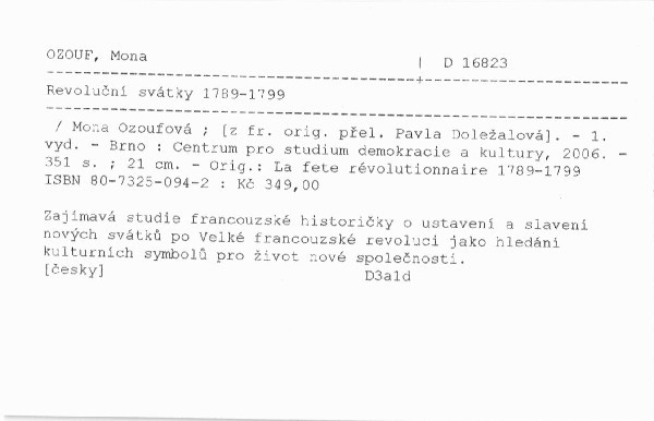 Zajímavá studie francouzské historičky o ustavení a slavení nových svátků po Velké francouzské revoluci jako hledání kulturních symbolů pro život nové společnosti.