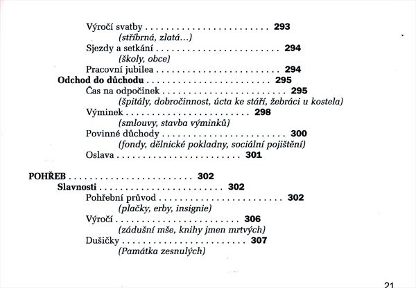 Dozvíte se o zvycích spojených s narozením dítěte, o oslavách narozeninách a jmenin, o dospívání a škole, o svatbě, manželství, ale i rozvodu, o svátcích starší generace a také o obřadech a tradicích spojených s koncem života člověka. Autorka zabíhá do dávné historie, srovnává zvyky se současností a také nám líčí, jak stejné oslavy a slavnosti prožívají ve vzdálených zemích. Vedle historického povědomí z knihy však především získáme zkušenosti a rady, které jsou potřebné a velmi aktuální pro dnešní život. Kniha nepřímo navazuje na předchozí úspěšný titul edice OKO České zvyky a obyčeje. Knížka může vhodně doplnit učebnici dějepisu, ale především se uplatní v hodinách občanské výchovy na základních školách. Nakladatelská anotace.