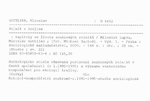 Sociologická studie věnovaná postavení soukromých rolníků v české společnosti (v letech 1991-1995)a významu venkovského hospodaření pro ekologii krajiny.