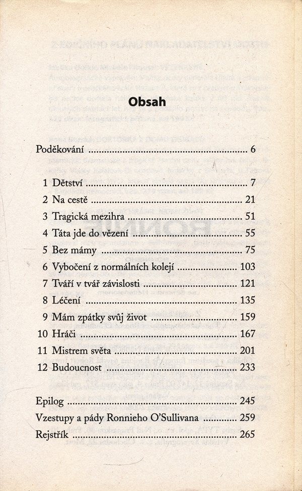 Autobiografie nejlepšího hráče snookeru je otevřenou zpovědí muže, který má své osobní problémy i velký talent. Ronnie O'Sullivan se rozepisuje o svém dětství, o začátcích své hráčské vášně a umění. Přibližuje rodinu, ve které vyrůstal, problematické osudy jejích členů a z toho plynoucí nelehké určení vlastní povahy. Publikace je tak nejen přehledem úspěšné kariéry rekordmana a geniálního hráče sookeru, ale také sondou do duše mladého muže, který se zmítá ve vlastních problémech se sebou samým. Tak se čtenář seznamuje např. s Ronnieho zkušenostmi z protidrogové léčebny nebo s problémy jako jsou deprese, nízká sebedůvěra, alkoholismus či agrese. Publikace je doplněna O'Sullivanovými fotografiemi ze sportovního i soukromého života.