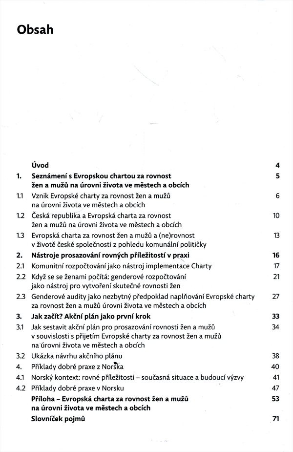 Sborník z konference přináší nejrůznější nápady pro dosažení rovnosti mezi muži a ženami ve městech a obcích. Seznamuje nás rovněž např. s Evropskou chartou za rovnost žen a mužů na úrovni života ve městech a obcích.
