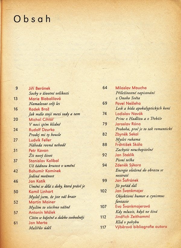 Rozhovory s umělci o jejich tvorbě a o českém výtvarném umění, již dříve publikované v novinách a časopisech.