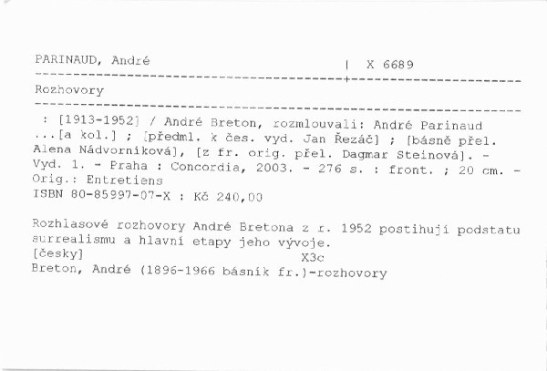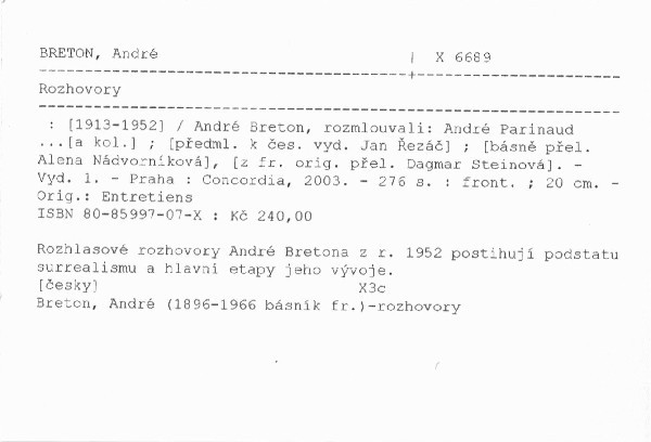 | Autor | André Breton, rozmlouvali: André Parinaud ...[a kol.] ; [předml. k čes. vyd. Jan Řezáč] ; [z fr. orig. přel. Alena Nádvorníková], [Dagmar Steinová] |