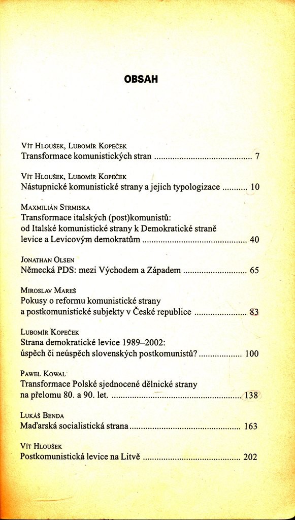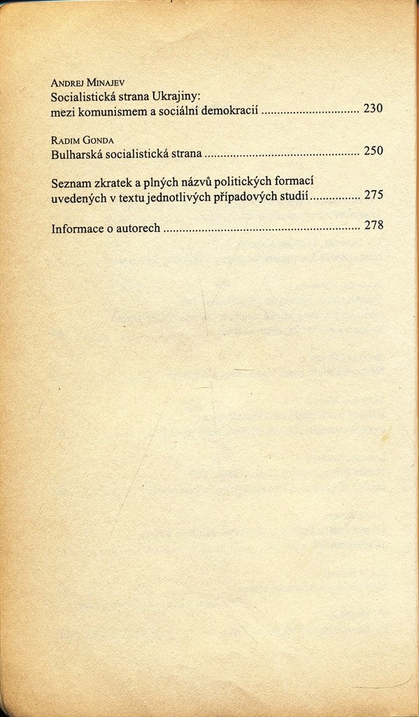Sborník studií. Změna původní identity bývalých komunistických stran v 80.a 90. letech 20.stol. Vnitrostranický vývoj, změna ideologie i personální změny v kontextu celkového politického vývoje postkomunistických států bývalého sovětského bloku. Další perspektivy vývoje transformovaných politických subjektů.