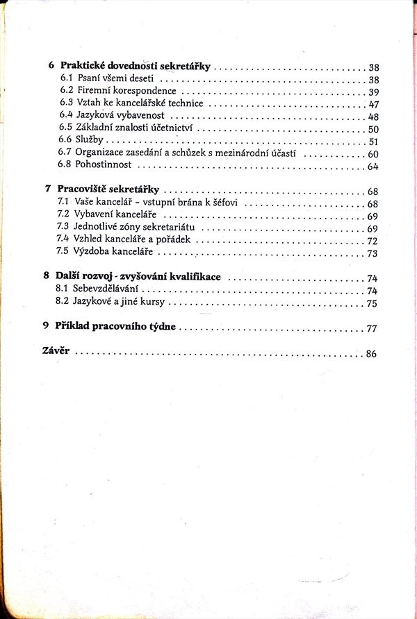 Autorka se postupně věnuje nejrůznějším aspektům činnosti sekretářky: práce s výpočetní technikou, jazyková vybavenost, organizace času, uspořádání a vzhled pracoviště. Nechybí ani kapitoly o vzhledu, chování a vztazích k nadřízeným i podřízeným.