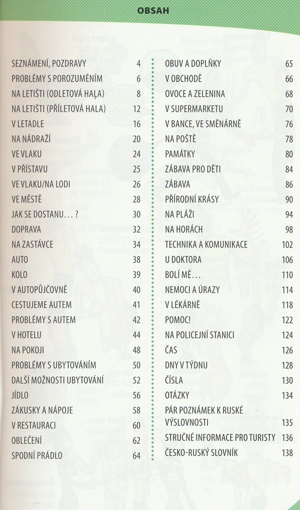 Slovíčka i fráze, které lze využít na letišti, na nádraží, v hotelu, v obchodech či v lékárně. Vedle ilustrací jsou uvedena slovíčka i s výslovností a často používané výrazy. S pomocí této příručky se budeme v cizině moci zeptat na cestu, koupit si jízdenku či vyměnit peníze v bance.