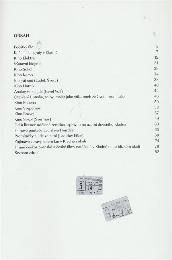 Publikace mapuje dějiny biografů a podnikání ve filmových projekcích v Kladně od prvních kočovných biografů z přelomu 19. a 20. století až do současnosti a s přihlédnutím k historii jednotlivých městských biografů.