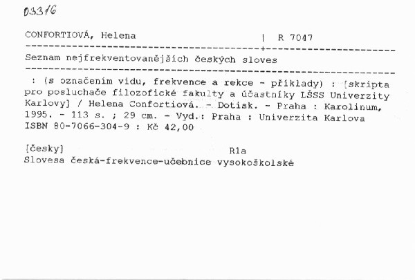 | Podnázev | (s označením vidu, frekvence a rekce - příklady) : [skripta pro posluchače filozofické fakulty a účastníky LŠSS Univerzity Karlovy] |