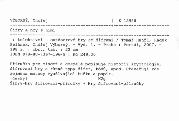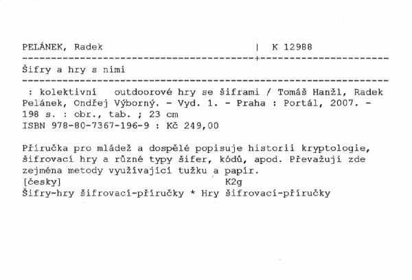 Příručka pro mládež a dospělé popisuje historii kryptologie, šifrovací hry a různé typy šifer, kódů, apod. Převažují zde zejména metody využívající tužku a papír.