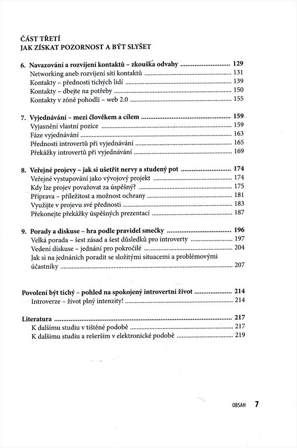 Příručka popisuje charakteristické vlastnosti introvertů i extrovertů, vysvětluje, jak obě dvě skupiny lidí získávají energii, uvádí přehled silných (např. empatie, schopnost naslouchat, dobré analytické myšlení) i slabých stránek introvertních lidí (strach, pasivita, velký důraz na detaily). Najdeme zde rovněž rady ohledně hledání partnera, komunikace s partnery, práce v týmech, řízení, vyjednávání, vedení diskuze nebo rozvíjení kontaktů.