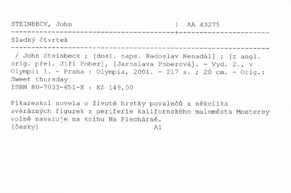 | Autor | John Steinbeck ; [dosl. naps. Radoslav Nenadál] ; [z angl. orig. přel. Jiří Pober], [Jaroslava Poberová] |