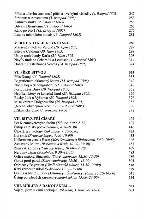 Autor v úvodních kapitolách rekapituluje vývoj napoleonských válek a dění na evropském kontinentě od roku 1800. Sleduje utváření třetí koalice tvořené Rakouskem, Ruskem, Anglií a Švédskem, soustředění francouzských sil na břehu Lamanšského průlivu, následný přechod Napoleonovy armády na území Svaté říše římské a průběh střetnutí u Elchingenu, Haslachu, Ulmu a Dürsteinu nebo bojové operace v Tyrolsku a Itálii. Důležitá pozornost je věnována nejen velmi důkladném popisu bitvy u Slavkova z 2. prosince 1805, ale i jejím důsledkům; setkání Napoleona a Františka I. i uzavření míru v Prešpurku (dnešní Bratislava), který znamenal pro habsburskou monarchii výrazné územní ztráty. Součástí textu jsou vzpomínky účastníků válečného tažení, medailony panovníků i velitelů a také informace o výzbroji, výstroji a organizaci tehdejších armád. Obrázky, mapy.