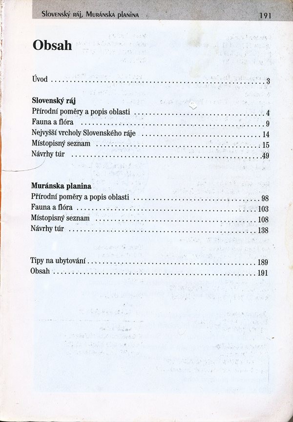 Průvodce především formou detailního popisu vybraných turistických tras seznamují s přírodními jedinečnostmi dvou slovenských národních parků - i u nás dobře známého Slovenského ráje a naopak opomíjené Muránské planiny. Kromě popisu turistických tras najde čtenář v obou částech publikace charakteristiku flory a fauny popisovaných regionů, stručný popis přírodních poměrů a místopisný seznam shrnující ve stručnosti vše podstatné o jednotlivých obcích, městech a přírodních objektech.