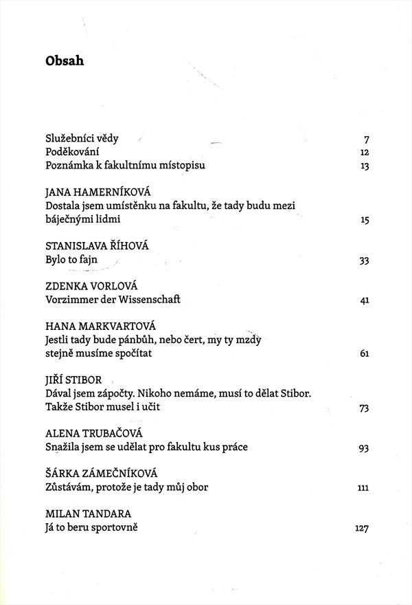 Rozhovory s dvanácti bývalými i současnými neakademickými pracovníky Filozofické fakultyUniverzity Karlovy. Vzpomínky pokrývají období počínaje rokem 1995 až po rok 2013.