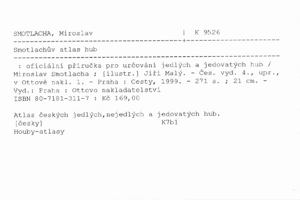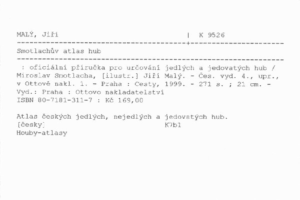 Základem atlasu a určovací pomůcky od významného českého mykologa je 100 barevných tabulí,na nichž jsou vyobrazeny vybrané druhy jedlých,nejedlých a jedovatých hub, s odpovídajícím textem na protilehlé straně.Houby jsou seřazeny do tří částí,právě podle jejich poživatelnosti,v každé části jsou pak uspořádány systematicky.Doprovodný text uvádí český,slovenský a latinský název i další běžně užívaná česká jména,popis houby,místo a dobu růstu,jedlost a informace o možnosti záměny s jiným druhem.V úvodní textové části jsou kapitoly o životě hub,o mykologických znacích nutných pro určování hub,informace o sběru,výkupu,prodeji a zpracování hub i o nebezpečí hub jedovatých. 15.11.1999 Selinges OCH = K7b1