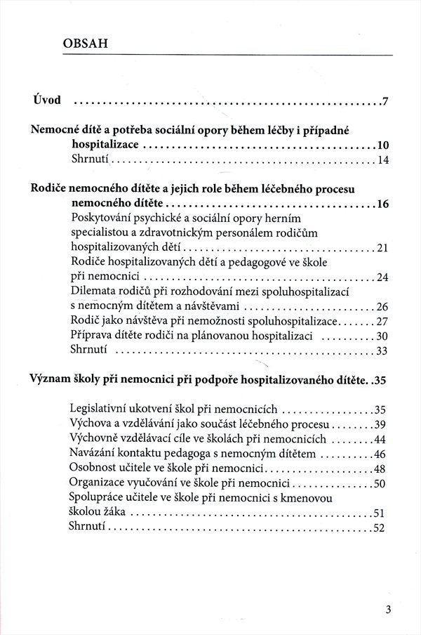 Role rodiče při léčbě nemocného dítěte, význam školy při podpoře hospitalizovaného dítěte, pohled na herní terapii v ČR a Británii, různé formy podpory hospitalizovaného dítěte, psychologické aspekty nemocných dětí.