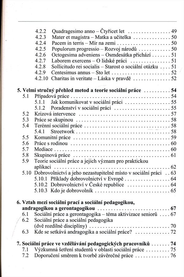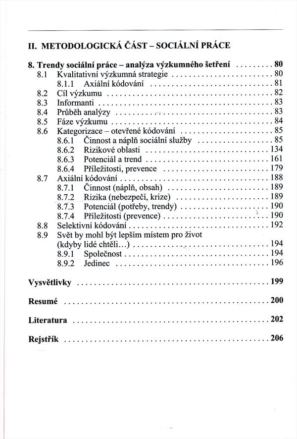 První část učebnice obsahuje definici, nástin teorie i přehled metod sociální práce. Druhá a větší část knihy obsahuje analýzu kvalitativního výzkumného šetření mezi odborníky i laiky, kteří se zajímají o sociální práci. Cílem výzkumu bylo získat stanoviska odborníků k různým oblastem sociální práce. Výzkumná otázka tedy zněla: Jak vnímáme sociální práci v kontextu změn, které přinesl její rozvoj v posledních letech? Publikace je určena spíše pedagogickým pracovníkům, metod a teorií si všímá okrajově, snaží se spíše poukázat na oblasti a trendy, které lze využít v rámci pedagogických činností.