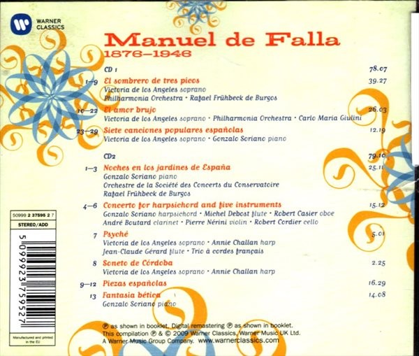 | Název dílčí části | Sombrero de tres picos --; Amor brujo --; Siete canciones populares espan~olas --; Noches en los jardines de Espan~a --; Concerto for harpsichord and five instruments --; Psyché --; Soneto de Córdoba --; Piezas espan~olas --; Fantasia bética |