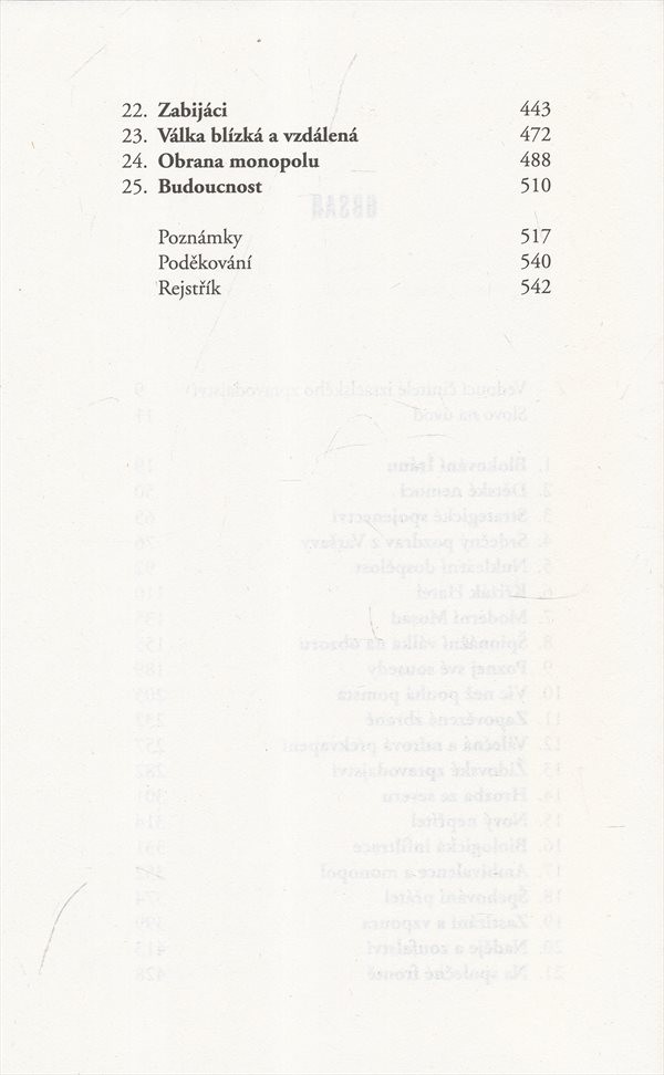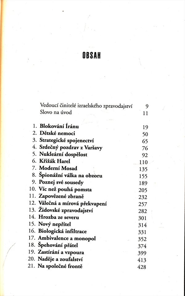 Práce sleduje převážně činnost Mossadu. Menší pozornost je zaměřena také na další tajné služby židovského státu (Aman, Šabak, Nativ nebo Lakam). Text popisuje počátky Mossadu, jeho strukturu, vztahy k cizím zpravodajským službám (CIA, BND), metody získávání spolupracovníků, průběh operací v zahraničí (např. únos Adolfa Eichmanna, kybernetické útoky proti Íránu, boj proti teroristům atd.). Pozornost je věnována také izraelské vnitřní i zahraniční politice, izraelsko-arabským válkám a izraelsko-palestinským vztahům. Poznámkový aparát.